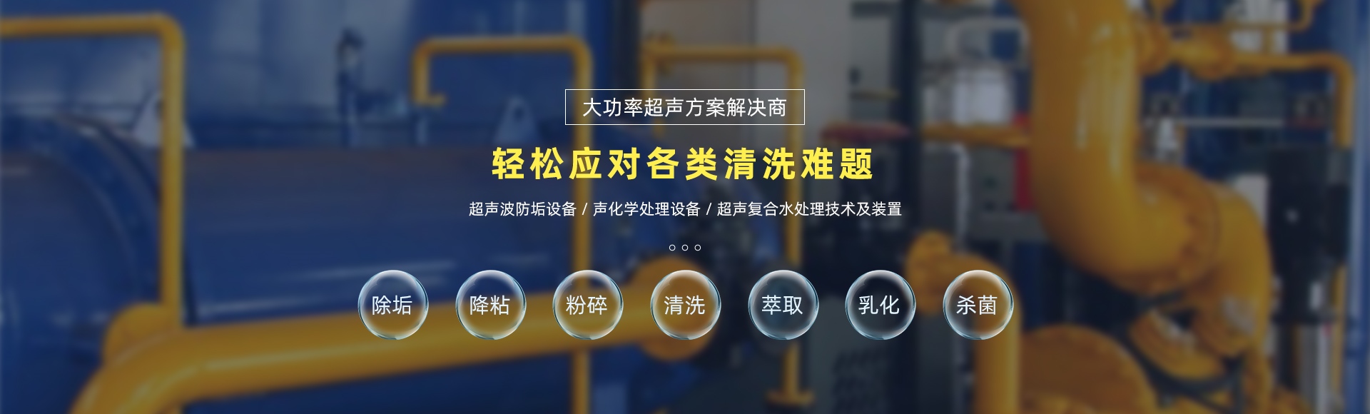 超聲波防除垢系列設(shè)備、超聲波破乳除油設(shè)備、超聲波鉆井廢液處理裝置、聚能式超聲波流體處理設(shè)備、超聲臭氧復(fù)合水處理技術(shù)及裝置、超聲電脫鹽復(fù)合技術(shù)及裝置、超聲波污泥處理技術(shù)及裝置、超聲氨氮吹脫技術(shù)及裝置、超聲中藥提取純化技術(shù)及裝置等超聲復(fù)合處理技術(shù)及裝置是“九洲”功率超聲應(yīng)用的主要成果。